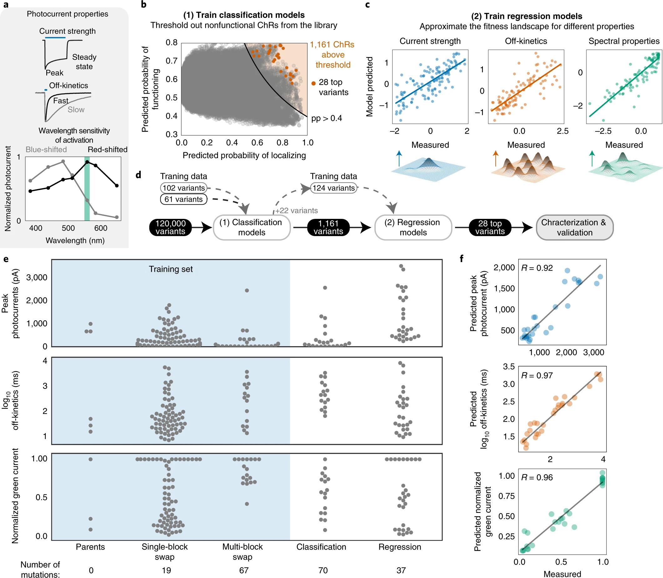 首先,为优化ChRs的光电流强度、波长特异性和动力学特性,作者通过高斯过程分类与高斯过程回归模型,在120000种理论上存在的ChRs中筛选出上述三类特性俱佳的28种ChRs(图1a-d)。然后,作者将这28种ChRs表达于HEK细胞并通过膜片钳电生理手段检验其性质是否符合预期。他们发现,这些ChRs的性质均与高斯过程预测的性质高度一致(图1e-f),表明此机器学习方法可应用于ChRs的优化过程。
